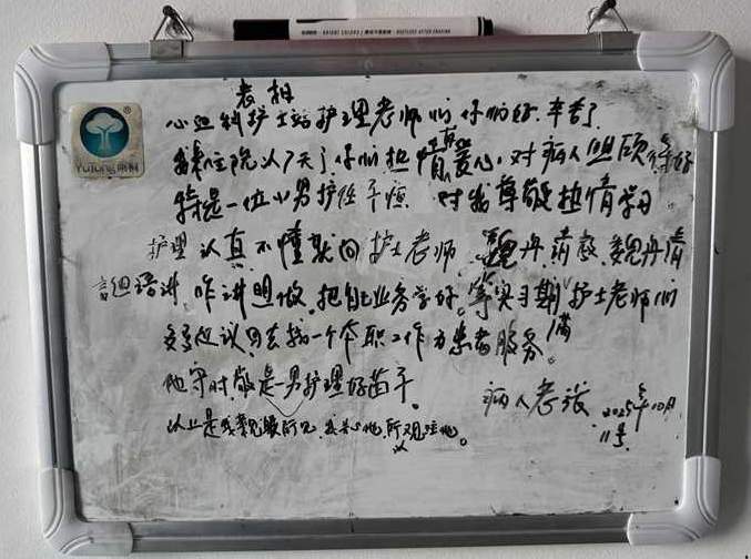 更让张婆婆记在心里的,是病房里常能看到的“师生日常”:带教老师魏丹总会手把手指导任子恒——怎么跟患者说话更亲切、怎么操作能让患者更舒服。“老师教得细,眼里全是关心;孩子学得认真,眼睛亮闪闪的。看到这样的传承,我特别放心!”这封没署名、没盖章的“黑板表扬信”,很快在医护和患者间传开。它不只是一位老人的感谢,更是对医疗工作者坚守、医学教育者付出的最好肯定。